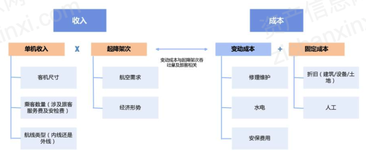 机场收入主要为旅客服务费用、飞机起降费用以及机场费收入,皆为直接向航空公司收取的项目,一定程度反映在机票票价上。成本方面,以首都机场为例,其成本主要来自于五大块,分别为:折旧摊销、修理维护、水电、人工以及安保。首都机场的人工成本占比是几大上市机场中最低的,而广州机场与浦东机场的人工成本都达到总成本的1/3左右。其原因在于首都机场基本采用了全外包的经营模式,只保留了机场核心业务,节约了很多的人工成本。而广州机场之前几年保留了大量的辅助业务,如地面运输、安检、加工修配业务等,导致人员成本较高,占比最高时甚至达到总成本的四成以上。北京首都机场对非核心业务进行外包的做法可以一定程度上减少人工成本,且提高外包业务的专业化程度,是值得推荐的运营模式。广州机场这两年通过外包非核心业务也显著减少了人工成本的占比。其次,航空类收入影响因素主要有两方面: