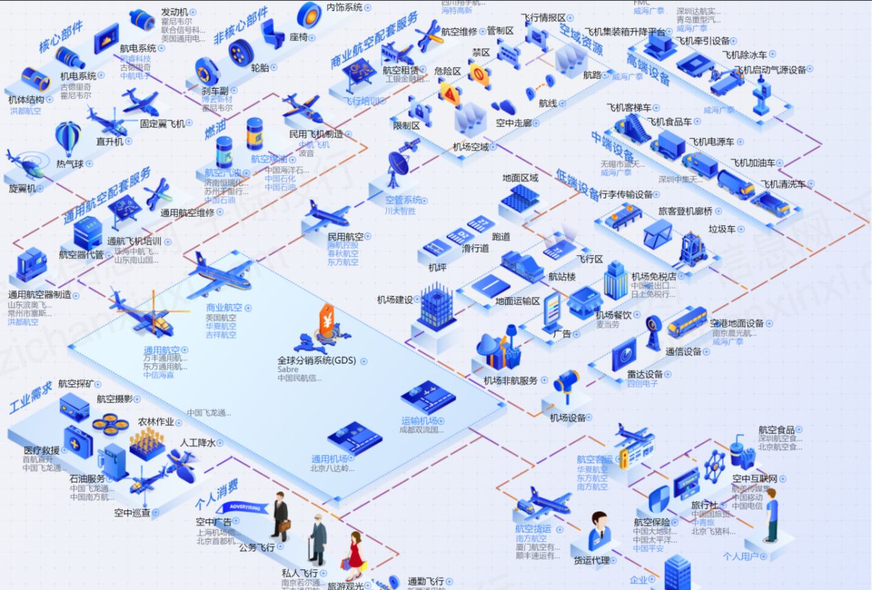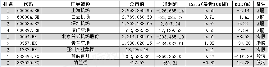 中国主要企业有上海机场[600009.SH]、白云机场[600004.SH]、深圳机场[000089.SZ]、厦门空港[600897.SH]、北京首都机场股份[0694.HK]、美兰空港[0357.HK]、亚洲实业集团[1737.HK]、首航直升[832494.NQ]、纳兰德[837525.NQ]等。