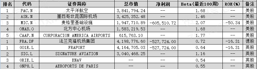 全球非中国主要企业有太平洋航空[PAC.N]、墨西哥坎昆国际机场[ASR.N]、麦格里基础设施[MIC.N]、北方中心机场[OMAB.O]、CORPORACION AMERICA AIRPORTS[CAAP.N]、法兰克福机场集团[FRA.DF]、FRAPORT[0O1R.L]、SIGNATURE AVIATION[SIG.L]、ENAV[0RIE.L]等。