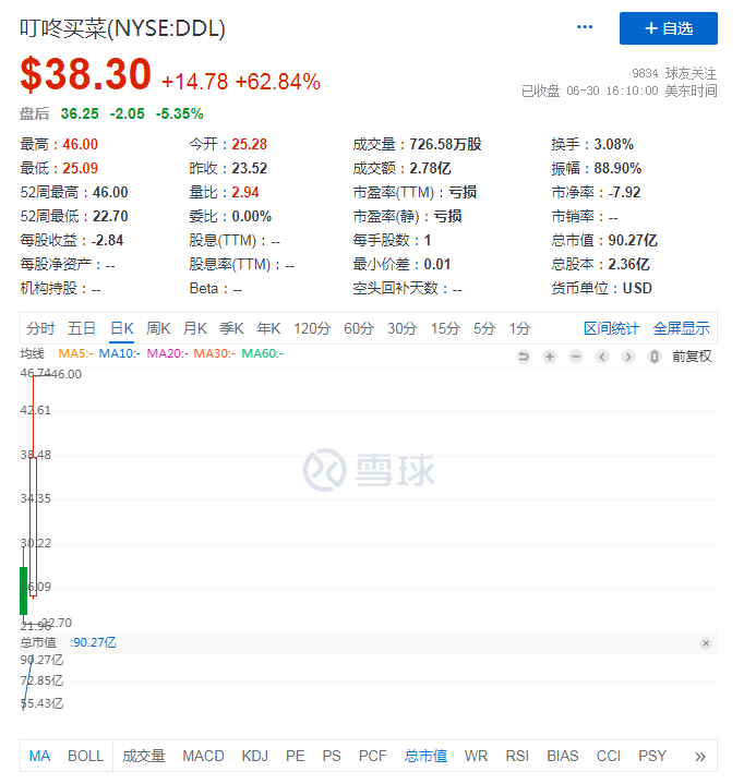 上市后一天,与每日优鲜继续下跌不同,叮咚买菜一度暴涨95%,最终收涨62.84%,市值超90亿美元。不过经纬中国合伙人张颖表示,这似乎是因为部分投资人弄错了刚上市的滴滴(DIDI)和叮咚买菜(DDL)的股票代码,闹出了一场乌龙?此前房多多在去年也出现过暴涨,当时也有一些猜测说是部分投资者可能将与拼多多弄混。