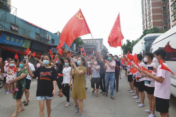 “没有共产党就没有新中国……”广电城市服务战疫先锋队手举五星红旗,与居民共同高歌,宣告荔湾战疫工作取得来之不易的胜利,感恩在党的领导下战胜疫情,献礼建党百年华诞。