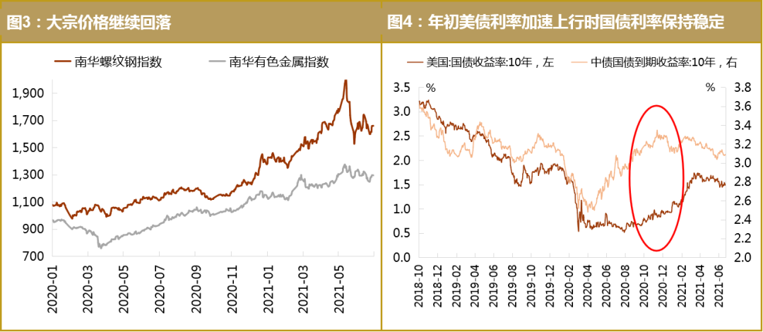 虽然市场较为担忧美联储过快收紧流动性的传导,但由于中美两国疫情爆发的时间点、抗疫方式、经济复苏节奏的差异,我国10年期国债收益率早已在去年5月领先于美国上行,而在今年年初,美债收益率加速上行时期则保持了相对稳定的走势,我们认为国内货币政策仍有足够的抉择空间;同时,考虑大宗商品下半年有望回落,通胀压力减轻后,国内利率无收紧的需求,且在经济增长趋缓情形下,可能在必要时趋向边际宽松。