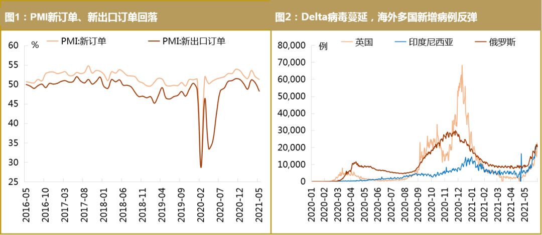 5月PMI新订单下降2.3个百分点至51.3%,PMI新出口订单更是降至48.3%萎缩区间,内外需均现疲软。根据IMF预测,三季度美欧经济增速将触顶回落,同时,考虑近期Delta变异毒株扩散,英国、俄罗斯等多国疫情重现恶化,我们判断外需可能进一步下行,国内经济增速回落趋势确定且扰动因素增多。