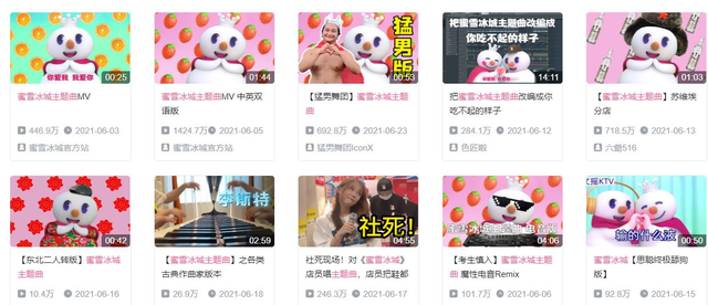 其二,二次复制创作使其加速出圈;蜜雪冰城此次用“自黑”来吸引消费者眼球的营销方式给年轻人带去不少的新鲜感,在蜜雪冰城品牌官方号在B站上传了主题曲MV《你爱我,我爱你,蜜雪冰城甜蜜蜜》后,截止6月30日,中英双语版播收获了1424.7万的播放量。