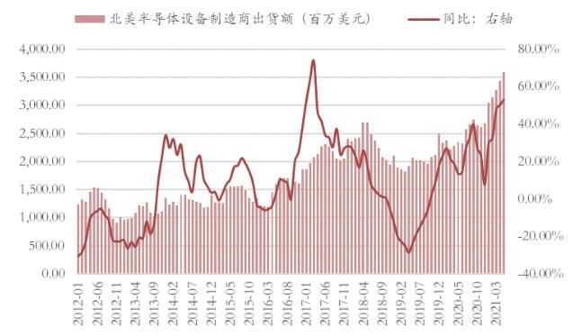 在2021年5月,我国进口半导体制造设备6,530台,金额28.7亿美元,1-5月的进口半导体制造设备数量和金额,同比升幅都超过了40%;在主要的半导体设备生产地北美,设备出货金额已经连续五个月创新高,在5月达到35.9亿美元,环比上升4.7%,同比大升53.1%。进口量和出货额的巨大升幅,预示着半导体行业的景气度持续上行。