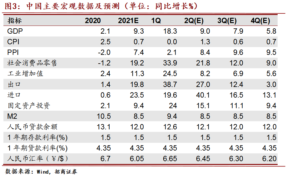 展望下半年,跨周期调节下,货币政策稳字当头,压制总需求不是价格问题解决之道;财政政策后置至少不会拖累下半年基建投资需求的释放;疫苗接种量的快速提升有利于下半年消费环比加速改善;房地产虽然受到政策调控,但此前高周转经营策略引起的施工缺口和交房压力已不容开发商继续缓建停建,在建安工程的驱动下,房地产投资将保持较快增长;下半年制造业投资的动力主要来自两方面,一是科技自立要求下高技术制造业投资保持高速增长,二是受益于全球复苏的装备制造业设备支出意愿的提升。外需方面,随着群体免疫的目标达成,欧洲也将于下半年加入全球共振行列。总的来看,中国经济的需求侧仍有扩大的空间,下半年中国经济恢复常态提供了更加坚实的条件,3、4季度GDP同比增速虽然回落,但环比增速将较为稳定,我们预计全年GDP增长9.3%。