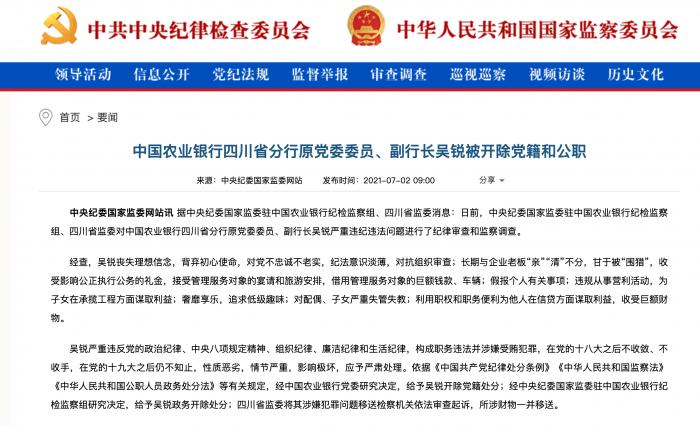 7月2日,中央纪委国家监委网站公告,据中央纪委国家监委驻中国农业银行纪检监察组、四川省监委消息:日前,中央纪委国家监委驻中国农业银行纪检监察组、四川省监委对吴锐严重违纪违法问题进行了纪律审查和监察调查。