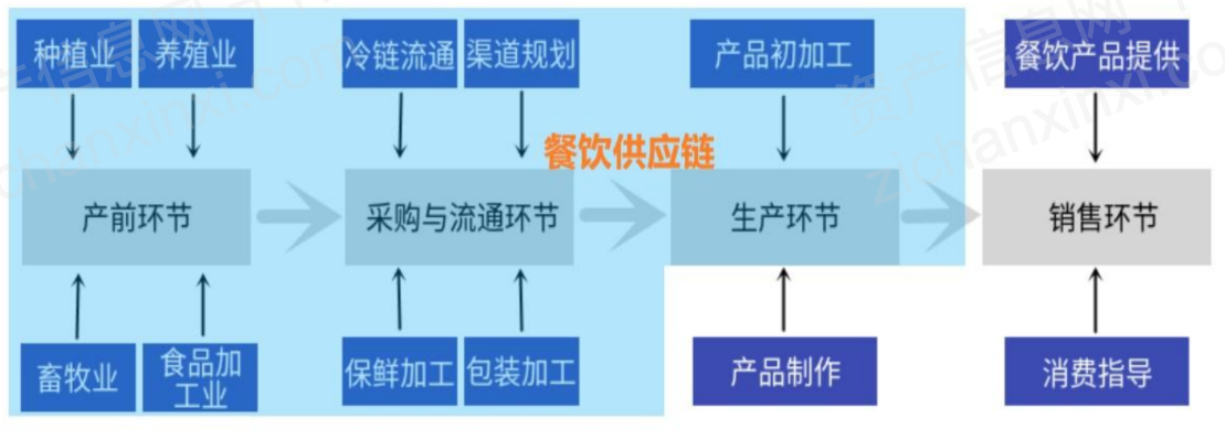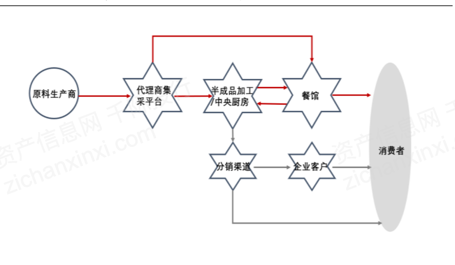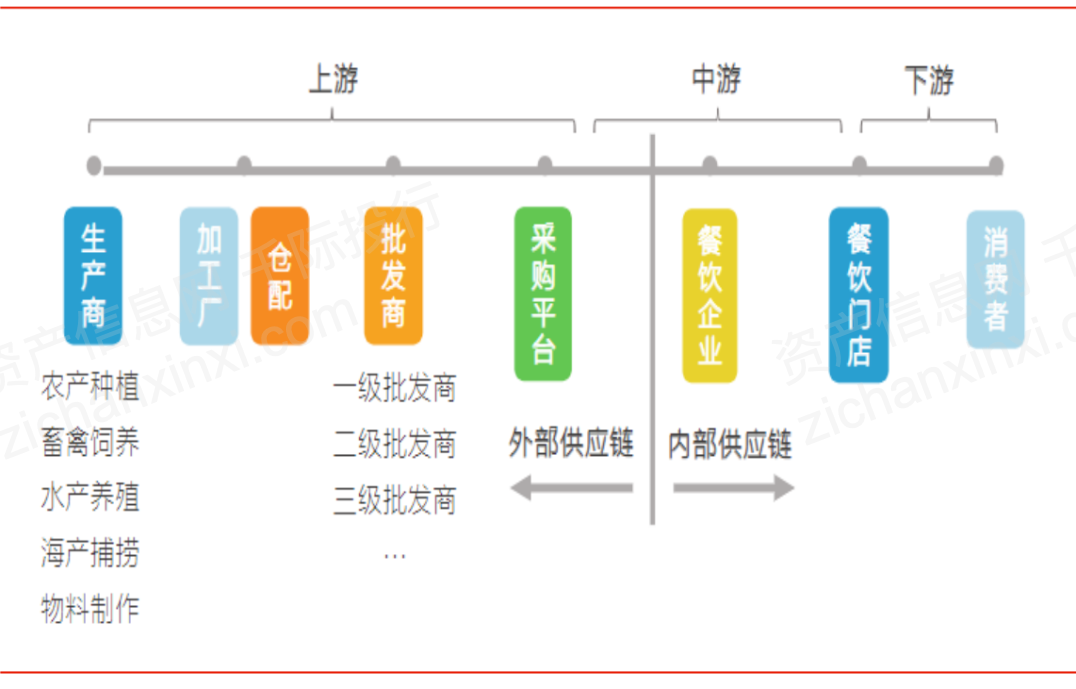 餐饮的食材供应从原料生产商最终到餐厅,要经过多级批发商,中间环节的加价率为众多食材B2B企业所觊觎。从整个产业链条来看,中国餐饮食材供应链的上、中、下游均处于极其分散的状态:上游供应商中分散的农户或中小型供应商占据重要比例,产业链的中游多为中小加工商和流通商,产业链下游是数量庞大的餐饮商户,最后到达消费者。