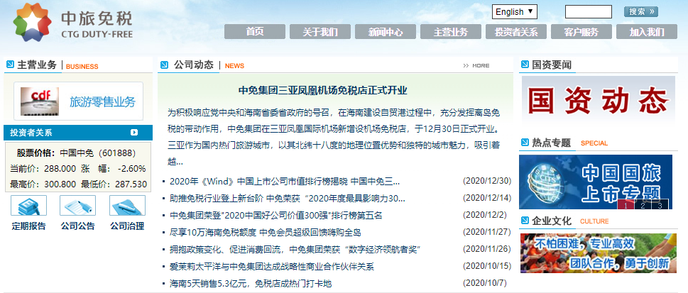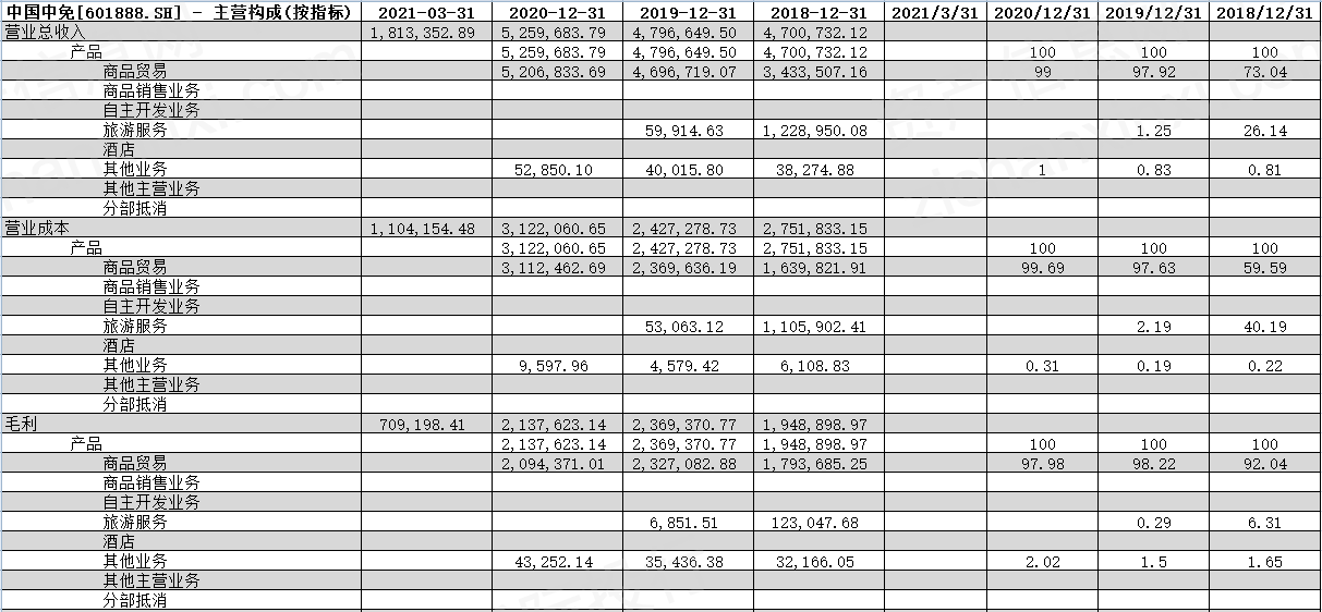 (1) 中国中免[601888.SH]所属行业为旅游业,目前主要从事旅行社业务和免税业务,其中旅行社业务主要包括入境游、出境游、国内游、会奖旅游、签证服务、商旅服务、航空服务、电子商务等业务;免税业务主要包括烟酒、香化等免税商品的批发、零售等业务。此外,公司还从事旅游综合项目开发业务,主要包括旅游综合项目投资开发、旅游景区景点投资开发和旅游股权投资等业务。公司下属全资子公司国旅总社、中免公司及国旅投资公司分别负责公司的旅行社业务、免税业务、旅游综合项目投资开发业务。