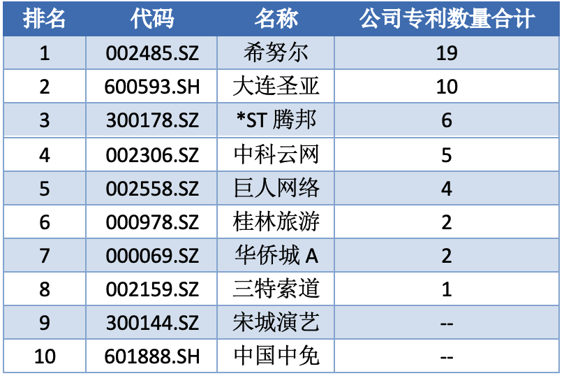 对餐饮旅游业行业的各个专利申请人的专利数量进行统计,排名前十的餐饮旅游公司依次为:希努尔、大连圣亚、*ST腾邦、中科云网、巨人网络、桂林旅游、华侨城A、三特索道、宋城演艺、中国中免等。