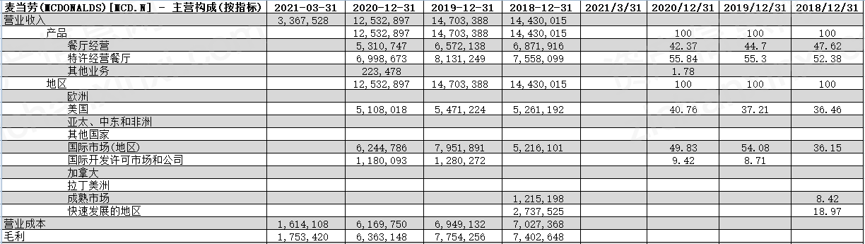 (1) 麦当劳(MCDONALDS)[MCD.N]是全球最大的连锁快餐企业,是由麦当劳兄弟和Ray Kroc在50年代的美国开创的、以出售汉堡为主的连锁经营的快餐店。主要售卖汉堡包以及薯条、炸鸡、汽水、冰品、沙拉、水果等快餐食品。