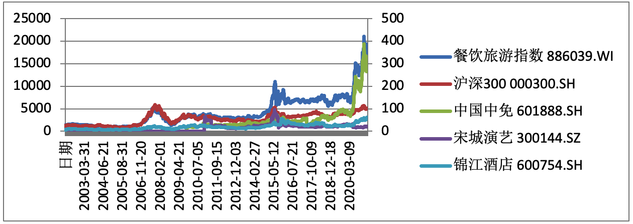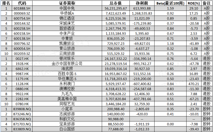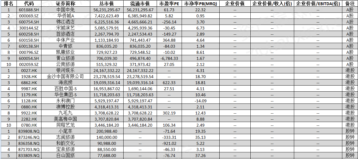 中国主要企业有中国中免[601888.SH]、华侨城A[000069.SZ]、锦江酒店[600754.SH]、宋城演艺[300144.SZ]、首旅酒店[600258.SH]、中体产业[600158.SH]、中青旅[600138.SH]、凯撒旅业[000796.SZ]、黄山旅游[600054.SH]、云南旅游[002059.SZ]、银河娱乐[0027.HK]、金沙中国有限公司[1928.HK]、海底捞[6862.HK]、百胜中国-S[9987.HK]、华住集团-S[1179.HK]、永利澳门[1128.HK]、澳博控股[0880.HK]、九毛九[9922.HK]、美高梅中国[2282.HK]、同程艺龙[0780.HK]、和韵文化[836358.NQ]、宝泉旅游[871703.NQ]、白山国旅[833809.NQ]等。