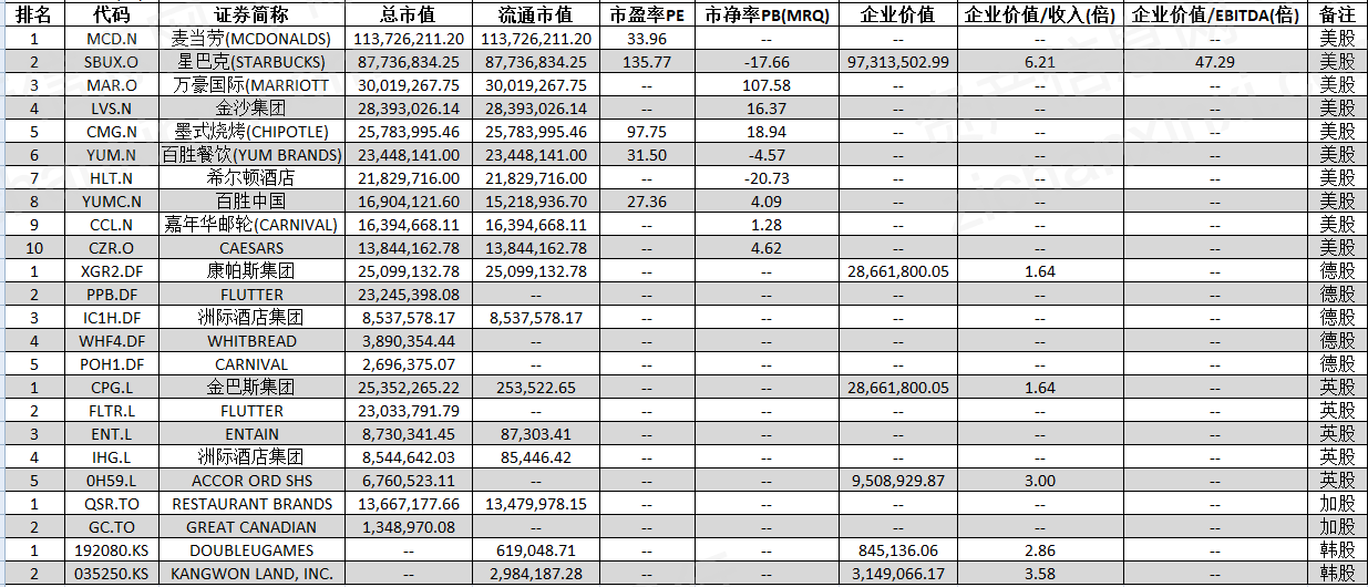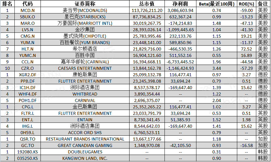 全球非中国主要企业有麦当劳(MCDONALDS)[MCD.N]、星巴克(STARBUCKS)[SBUX.O]、万豪国际(MARRIOTT INTL)[MAR.O]、金沙集团[LVS.N]、墨式烧烤(CHIPOTLE)[CMG.N]、百胜餐饮(YUM BRANDS)[YUM.N]、希尔顿酒店[HLT.N]、百胜中国[YUMC.N]、嘉年华邮轮(CARNIVAL)[CCL.N]、CAESARS ENTERTAINMENT[CZR.O]、康帕斯集团[XGR2.DF]等。
