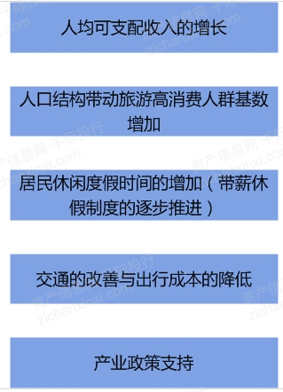 旅游业发展受居民收入、居民度假休闲时间、交通出行状况和成本以及产业政策的影响明显。居民人均可支配收入的增长、人口结构带来旅游高消费人群基数增加,国民收入的不断提高,是旅游消费不断增长的推动力,有助于旅游业的大力发展。