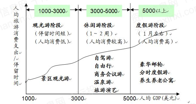 按照国际经验,当人均GDP达到1000元,观光游剧增;当人均GDP达到3000美元,休闲游骤升;当人均GDP达到5000美元,度假游逐渐旺盛。