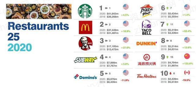 英国品牌评估机构Brand Finance发布了“2020全球最有价值餐饮品牌”排行榜(Restaurants252020)。其中有20个美国品牌,并且占据前十名中的8席,英国有2个品牌,中国、加拿大和菲律宾各有1个品牌上榜。星巴克、麦当劳、肯德基位居前三,排名4-10位的分别是赛百味(Subway)、达美乐比萨(Domino's Pizza)、必胜客(Pizza Hut)、塔可贝尔(Taco Bell)、唐恩(Dunkin')、海底捞、提姆霍顿(Tim Horton's)。