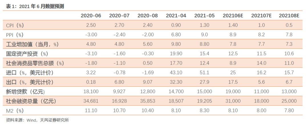 整体而言,6月外需整体旺盛,但持续的分化也延续了5月的市场表现,且已经进一步传导至了我国新出口订单与集装箱指数环比的回落。因此我们预计,6月出口总额可能仍将保持在强劲的水平,但环比可能在5月基础上进一步回落,下跌到负区间。具体来看,预计6月出口总额在2400-2600亿美元间,对应同比增速12.8-22.2%,折中取17.5%,对应环比增速-1.5%--9.1%,折中取-5%。折合二季度同比增速25.7%。