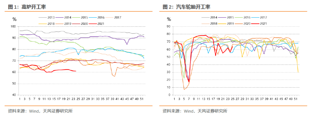 6月PMI生产指数回落0.8个百分点至51.9%,从高频数据来看,6月PTA、涤纶长丝、汽车轮胎开工率小幅回升,但多数中上游行业开工率均位于往年较低水平。工业生产动能整体偏弱,其中环保限产、汽车缺芯等供给端的因素构成重要扰动。预计6月工业增加值同比7.8%,两年平均增速6.2%。未来出口和房地产均面临较大的不确定性,短期来看韧性仍在,工业生产预计整体继续保持平稳。