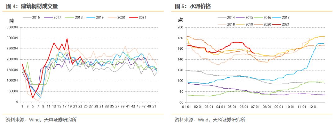 当前建筑业PMI整体偏弱,水泥价格、建筑钢材成交量均明显回落,显示建筑业景气度并不高。专项债发行节奏偏慢,政策稳基建的诉求不强,目前来看三季度专项债发行节奏也并不快,基建短期内难以有太大的起色;严监管下房地产周期趋于下行,当前房地产销售依然处于高位,预计房地产投资还能维持一定的韧性。