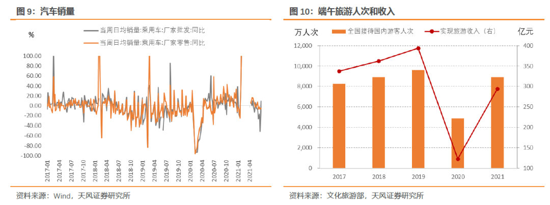 端午旅游消费偏弱。端午前三天全国国内旅游出游8913.6万人次,按可比口径恢复至疫前同期的98.7%;实现国内旅游收入294.3亿元,恢复至疫前同期的74.8%。可能受疫情反复影响,端午出行恢复程度要弱于五一假期。