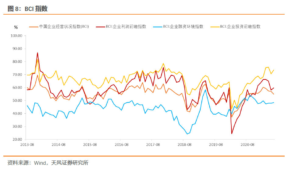 制造业PMI生产经营活动预期虽有回落但继续高位运行,制造业工业企业利润两年平均增速维持24.97%的水平,BCI指数整体回落但投资前瞻指数不降反升,因而制造业投资还是有其回升的微观基础,当前的需求格局下预计继续处于弱复苏状态。