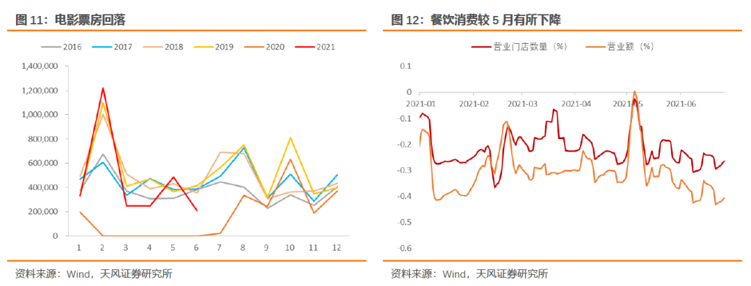 服务消费走弱。6月餐饮营业门店和营业额都较5月有所回落,电影票房下降更为明显。