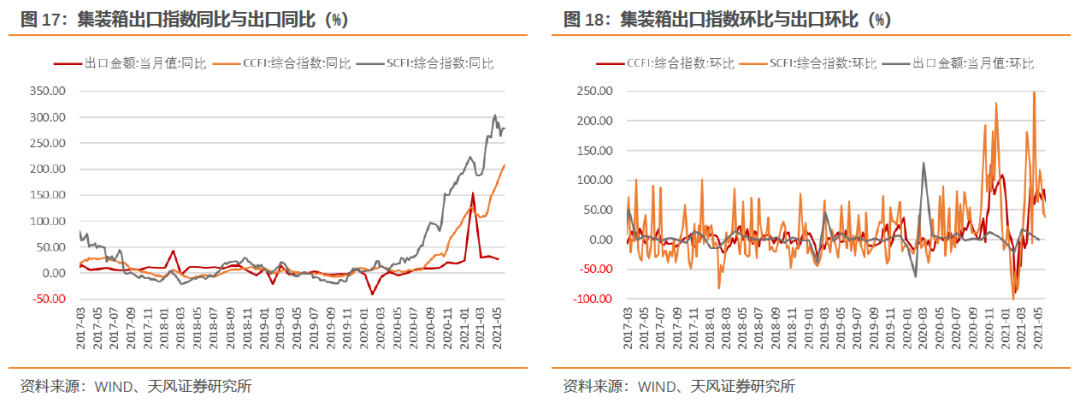 今年前5月,集装箱指数环比对出口环比的高指示度仍在延续,周度集装箱指数的整体趋势基本反映了月度出口的环比变化。