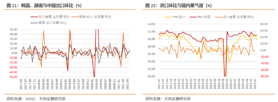 6月越南与韩国的出口环比有所提升,但考虑到4、5月受疫情影响时,越南、韩国出口环比的明显回落,在基数效应的影响下,6月越南、韩国出口环比的指示度并不高。