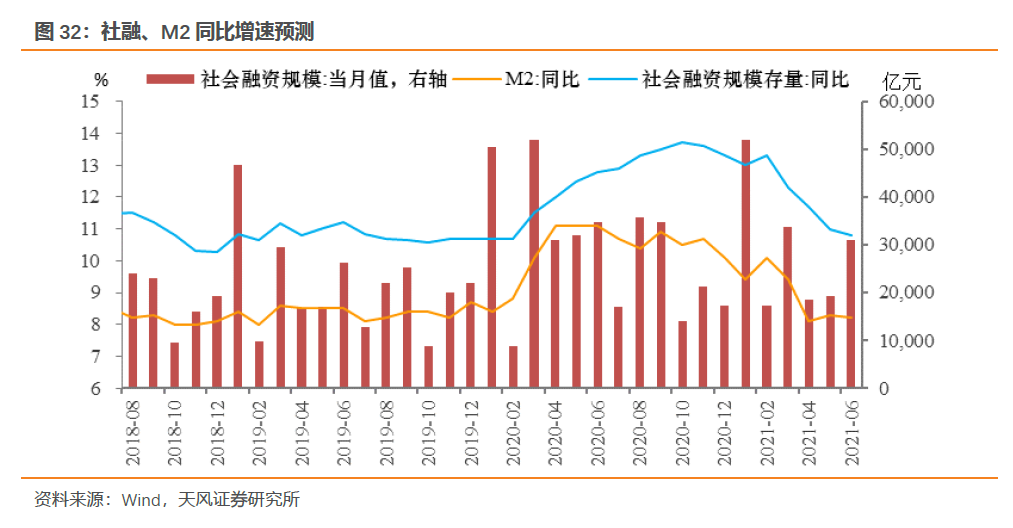 综合来看,我们预计2021年6月新增社融3.1万亿,较去年同期3.5万亿有所回落,社融增速回落到10.8%附近。