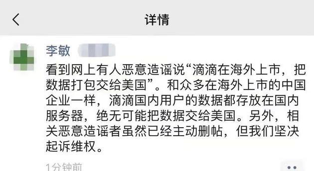 据新浪科技报道,近日有传言称滴滴为赴美上市把中国道路信息和用户数据泄露给美国。对此,滴滴副总裁李敏在朋友圈回应:看到网上有人恶意造谣说“滴滴在海外上市,把数据打包交给美国”。和众多在海外上市的中国企业一样,滴滴国内用户的数据都存放在国内服务器,绝无可能把数据交给美国。另外,相关恶意造谣者虽然已经主动删帖,但我们坚决起诉维权。