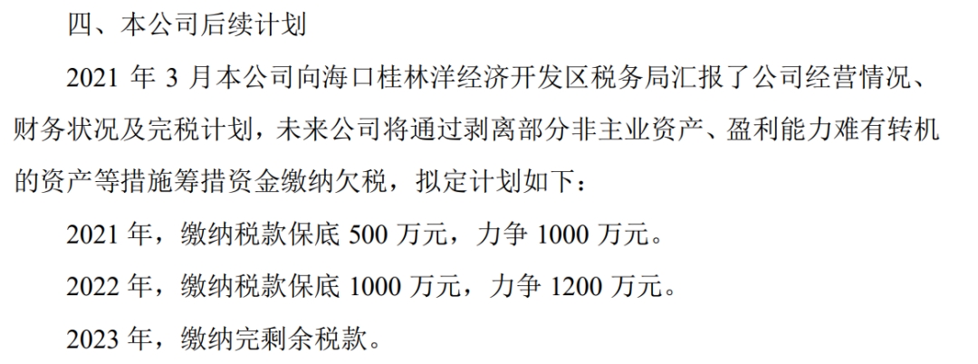 对于公司后续计划,ST大洲表示,2021年3月公司向海口桂林洋经济开发区税务局汇报了公司经营情况、财务状况及完税计划,未来公司将通过剥离部分非主业资产、盈利能力难有转机的资产等措施筹措资金缴纳欠税。