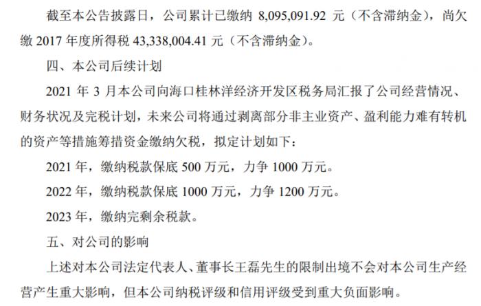 彼时公告表示,公司欠缴2017年度所得税4836万元,全资子公司海南新大洲实业有限责任公司欠缴房产税及土地使用税34万元。