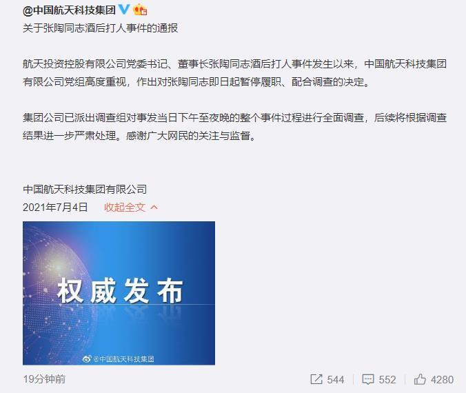 航天投资控股有限公司党委书记、董事长张陶同志酒后打人事件发生以来,中国航天科技集团有限公司党组高度重视,作出对张陶同志即日起暂停履职、配合调查的决定。