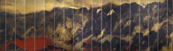事实上,以国画的形式展现毛泽东的诗词,颇有难度,既不能画成连环画,又不能画成纯粹的山水画。基于对1935年那场激烈战役的历史想象,我用3米高11米宽的巨大篇幅,全景式的构图,结合近景、中景、远景,通过千峰万仞、浮云飞度,苍山如海、残阳如血来展现沉雄壮阔的战争场面。而战斗的细节隐现在苍凉悲烈的近景中,叙述的真实与历史的丰厚浑融的笔墨中。