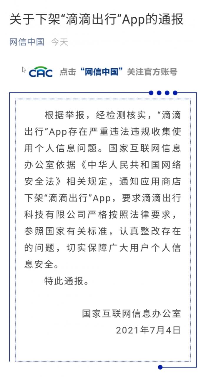 7月4日晚,“网信中国”公众号发布“关于下架滴滴出行App的通报”,全文如下: