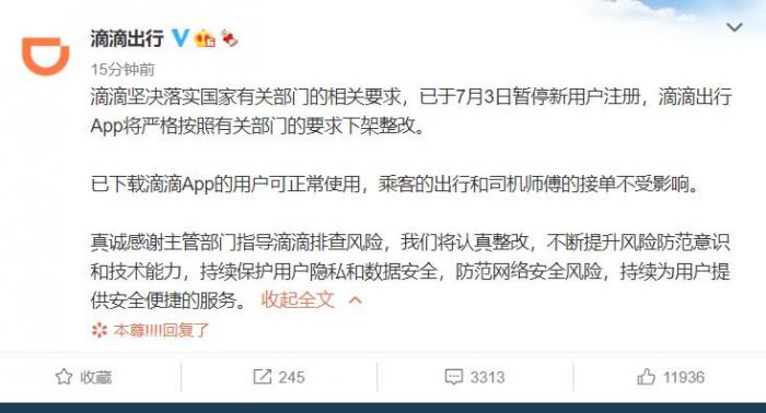 7月4日晚间,滴滴出行在官方微博回应,滴滴出行App将严格按照有关部门的要求下架整改。已下载滴滴App的用户可正常使用,乘客的出行和司机师傅的接单不受影响。
