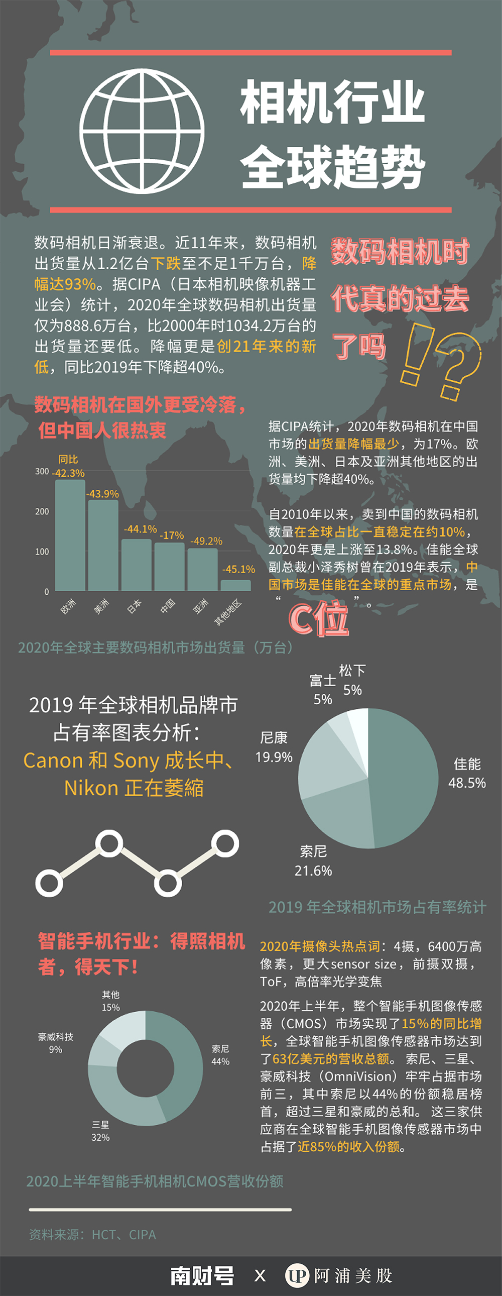 近年来数码相机在全球范围内销量锐减,11年间出货量从1.2亿台下降到2020年的不足千万。