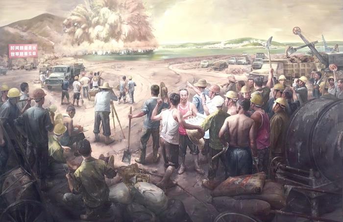 画面上,当年如春雷般炸响神州的炮声,响彻云霄,令人振奋。建设者们心潮澎湃,欢欣鼓舞,或展露笑容,或振臂欢呼,或用心观测,或埋头记录,更多则跷足抗首,内心的雀跃与激动都藏在无声地热望之中。此处无声,远处“炮声”轰响;此处人群聚集,远处土石飞散;山前水面已见微澜,远处的香港翘首凝望。一静一动之间,中国改革开放的历史大剧拉开了序幕。