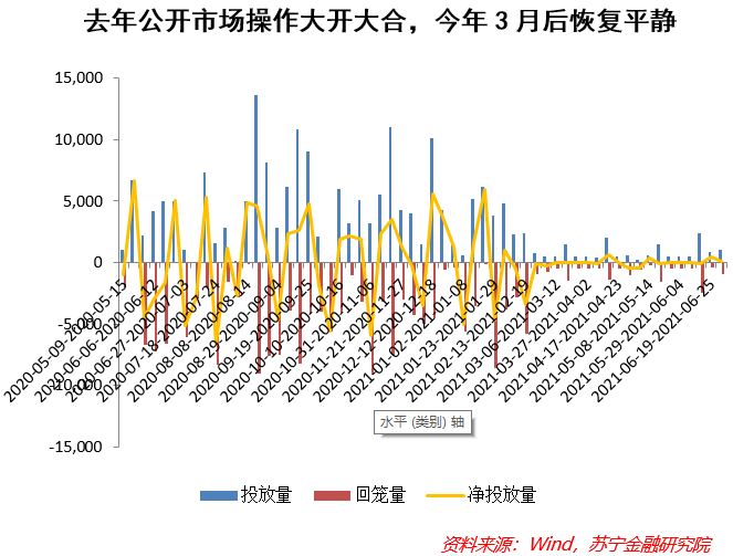 不过,同样是维护半年末流动性平稳,去年6月末,央行的操作手法主要是7天加14天逆回购,操作金额都超1200亿元,最高达2000亿元,即便单独单开7天逆回购,金额也在1000亿元以上。而今年则是仅开展7天回购,而且金额300亿元相对较小,原因有哪些?