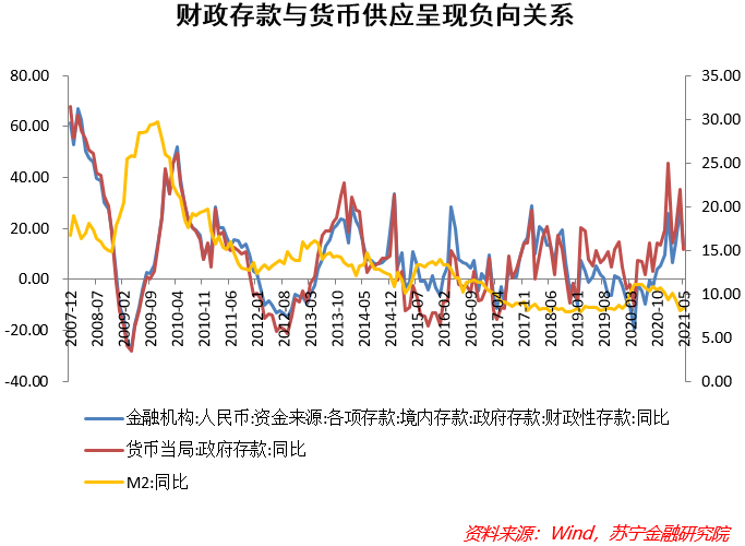 一般而言,央行资产负债表中的财政存款和央行基础货币呈负向关系。在央行资产负债表中的资产端不变的情况下,负债端的财政存款和基础货币此消彼长;金融机构信贷收支表中的财政存款也与广义货币供应呈负向关系,财政存款减少,通过财政政策流入实体经济,形成企业和个人存款,进而形成M2。由此看,财政政策不那么积极时,财政存款积累,形成银行体系流动性,同时却减少了货币供应,因此也让我们看到了上图红色虚框中与前期不同的货币供应和流动性之间的关系。
