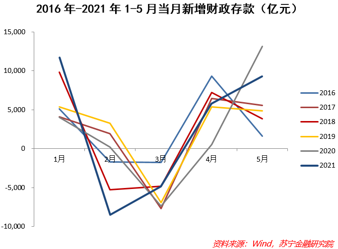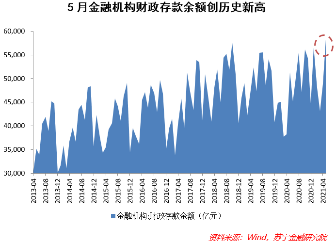 财政存款规模在近期维持极高水位,事实上5月金融机构的财政存款余额已经创下了历史新高。财政存款大量“堆积”在银行体系中,银行根本不缺钱。