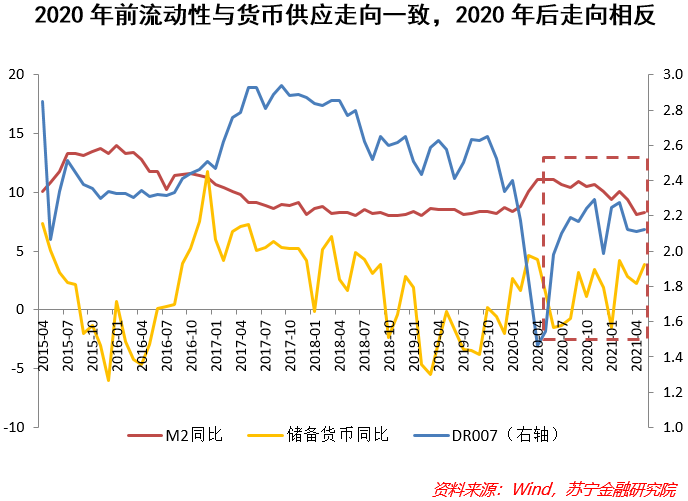 一般而言,DR007(衡量流动性的最重要指标,DR007高,银行拆借成本高,流动性紧)与货币供应的走势相反,但2020年下半年以来走势变得一致,反映了流动性和基础货币供应的关系出现了反转,这背后很大程度上是因为财政因素介入了进来。