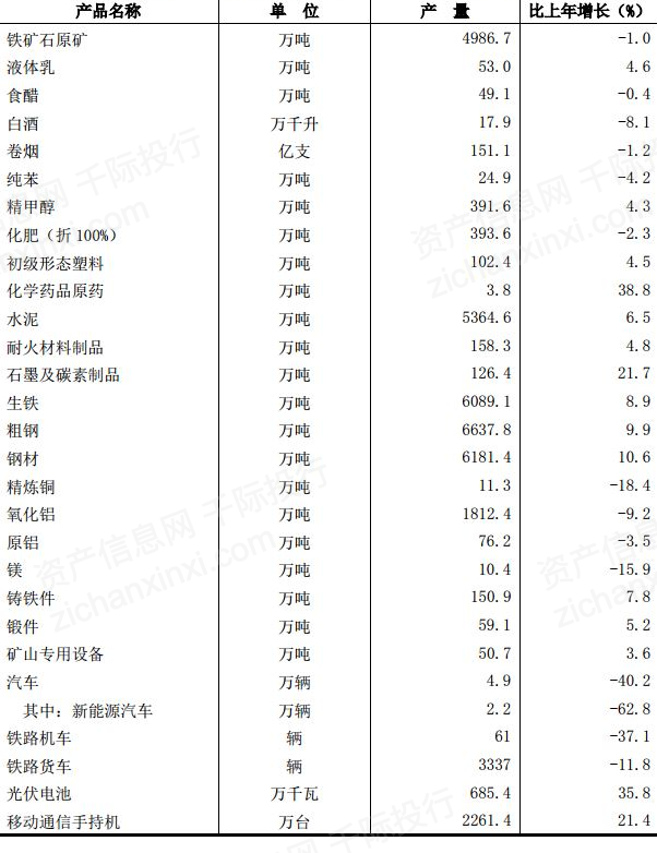 1-12月份,全省15种主要工业产品产量按增速从高到低依次为:化学药品原药增长38.8%,光伏电池增长35.8%,石墨及碳素制品增长21.7%,手机增长21.4%,钢材增长10.6%,粗钢增长9.9%,生铁增长8.9%,原煤产量增长8.2%,水泥增长6.7%,焦炭增长5.6%,精甲醇增长4.3%,发电量增长2.1%,原铝下降3.5%,氧化铝下降9.2%,新能源汽车下降62.8%。 全年发电量74170.4亿千瓦时,增长3.85%.