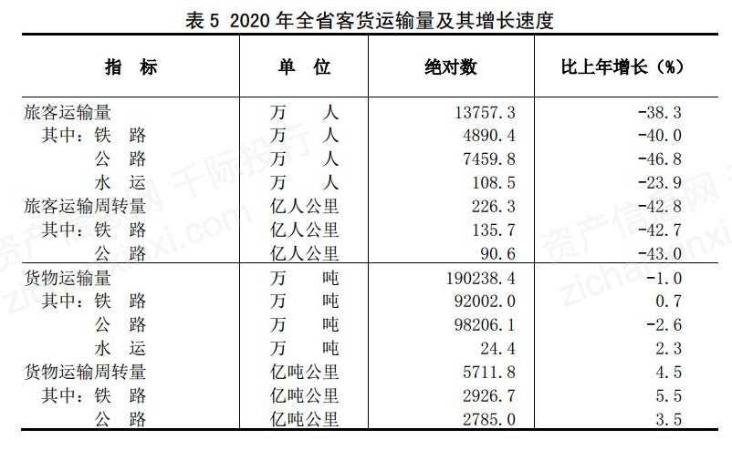 全年旅客运输量13757.3万人,比上年下降38.3%。旅客运输周转量226.3亿人公里,下降42.8%。货物运输量19.0亿吨,下降1.0%。货物运输周转量5711.8亿吨公里,增长4.5%。民航旅客吞吐量1298.6万人次,下降36.3%。年末全省公路通车里程14.4万公里,其中,高速公路5744.6公里。民用航空航线260条。