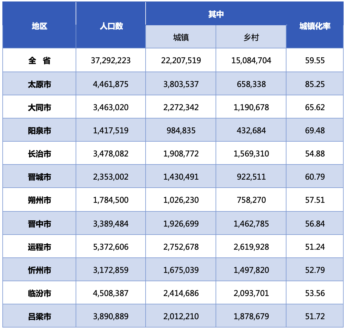 截至2019年末,山西省常住人口3729.22万人,比上年末增加10.88万人,其中,城镇常住人口2220.75万人,占常住人口比重为59.55%,比上年末提高1.14个百分点。全年出生人口33.97万人,人口出生率9.12‰;死亡人口21.79万人,死亡率5.85‰;自然增长率3.27‰。年末全省户籍人口城镇化率为41.87%,比上年末提高1.02个百分点。根据第七次全国人口普查结果,2020年11月1日零时山西省的常住人口为3491.5616万人。