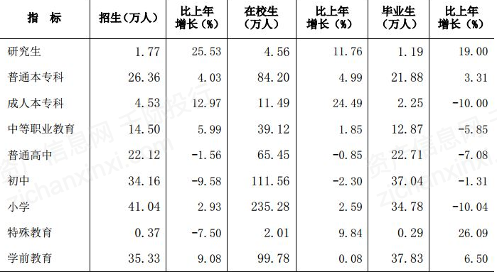 年末全省共有幼儿园7165所,小学5153所,普通初中1709所,普通高中518所,中等职业教育学校427所,普通高等学校85所,成人高等学校9所。全省学前教育毛入园率90.80%,小学学龄儿童净入学率99.97%,高中阶段毛入学率95.20%。