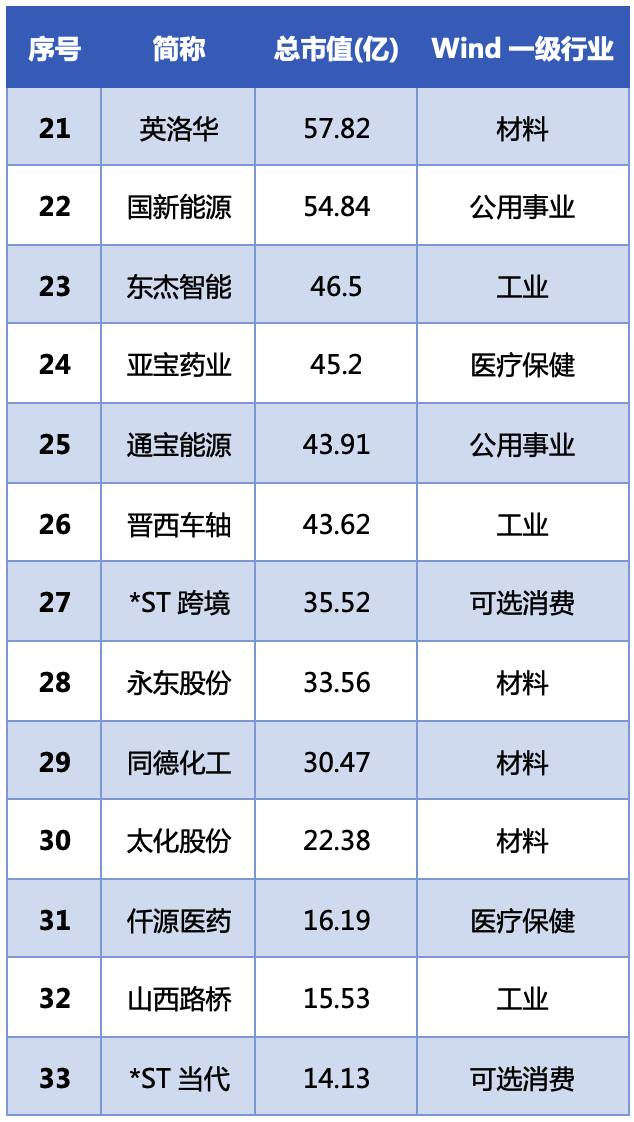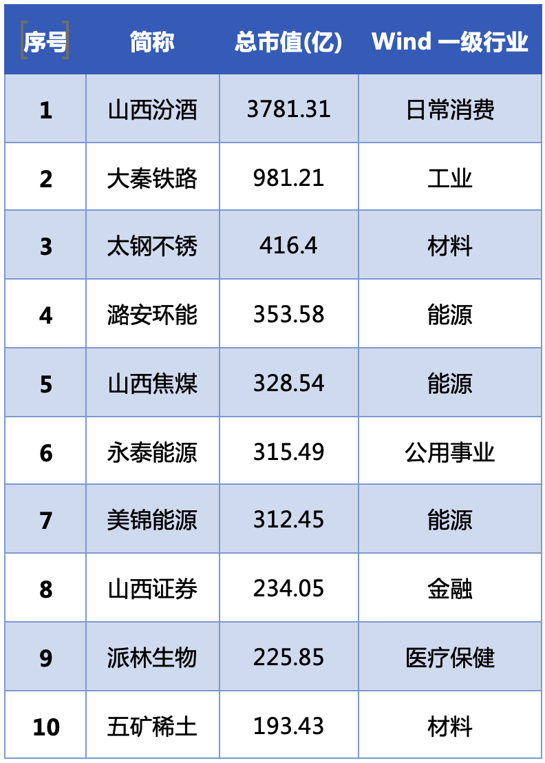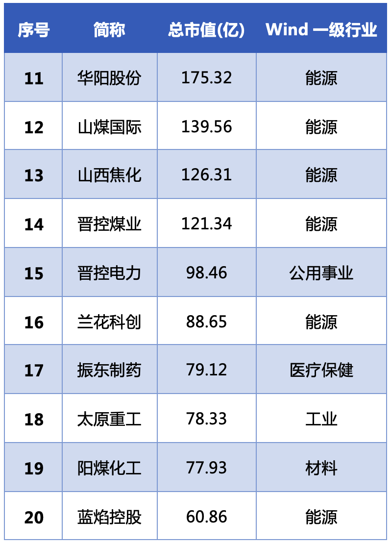 山西总共是33家上市公司的注册所在地,其中能源的上市公司在山西不论是数量还是市值上都占有一定的优势。另一方面,由于自汾酒的领先地位,导致在按市值分类时,日常消费行业的占比较高。同时,由于较好的自然禀赋,山西省的能源行业的占比也相对较高。