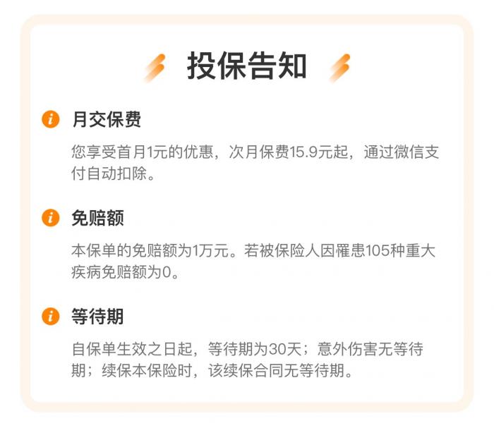 具体而言,从该产品保障情况看,适用人群为出生30天至60周岁(含),保障期间1年,等待期30天。一般医疗保险金200万元,105种重大疾病医疗保险金400万元,质子重离子医疗保险金与105种重大疾病医疗保险金共用400万元,70种重疾特别费用10万元,意外住院津贴100元/天、最高18000元。