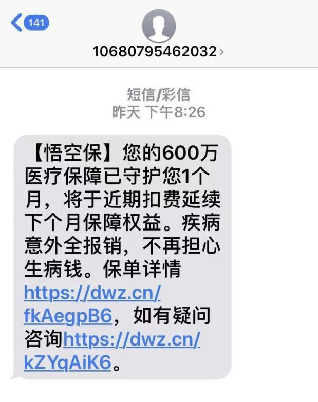 从这个层面上看,“被自动投保”这一情况并不准确。卢先生提供的短信截屏亦提示了这一点:“600万医疗保障已守护1个月,将于近期扣费延续下个月保障权益。”