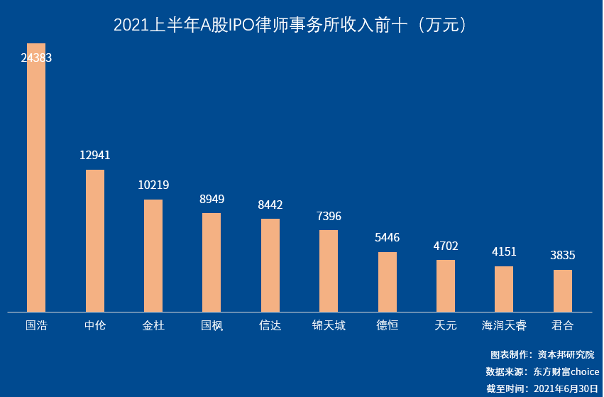 具体来看,国浩律师事务所上半年参与A股IPO担任法律顾问获得的收入为2.44亿元,排名第二的是中伦,为1.29亿,其次是金杜,为1.02亿元,仅有这三家从上半年的IPO中获得的律师费用超过1亿元。